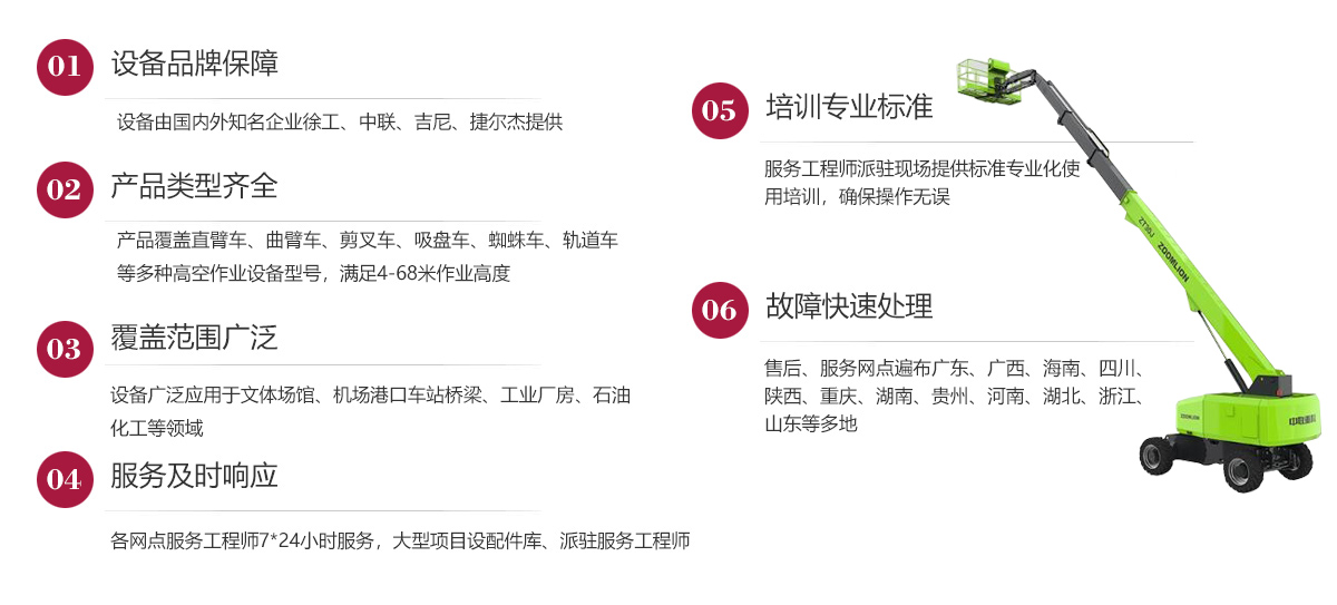公司產(chǎn)品系列齊全,品種豐富,覆蓋了剪叉式、直臂式、曲臂式、蜘蛛式及吸盤式等多型號高空作業(yè)車,滿足4至68米各種工作高度的施工要求。設(shè)備廣泛用于工程建設(shè)、文體場館、廠房搭建,施工維護(hù),幕墻裝飾、工程裝修、消防工程、市政工程、電力、通訊、高空管路鋪設(shè)、高架橋梁的建造、涂裝及各種大型工礦企業(yè)等場所。設(shè)備移動靈活,安全穩(wěn)定,能有效提高施工效率,降低工人勞動強(qiáng)度,縮短施工時間,節(jié)省施工成本,是高效安全施工的理想選擇。